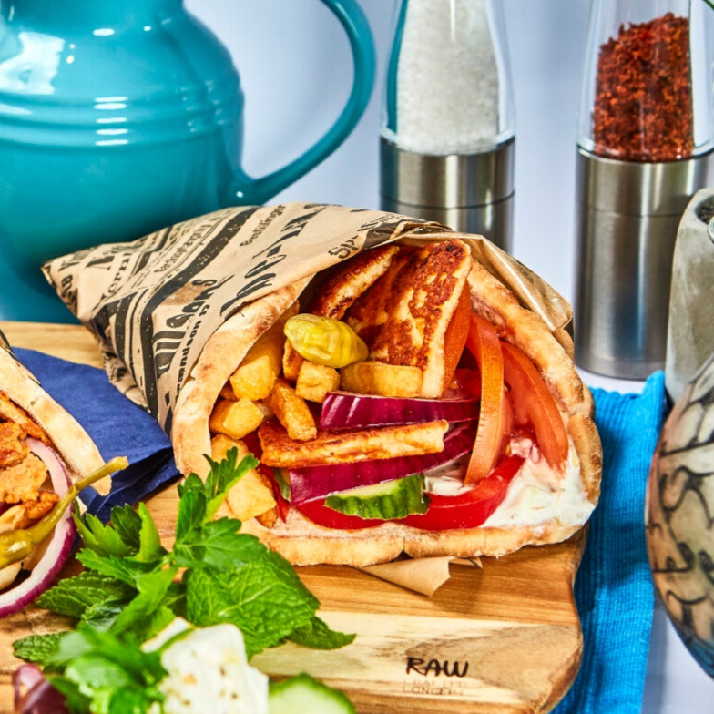 Our Gyros i Pita is a customer favorite. The Pita is made with halloumi and includes tzatziki, onions, tomatoes, greek pita bread and fries.